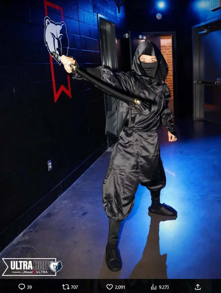 同日に本拠地でバックスと対戦するグリズリーズの選手たちも仮装して会場入り。今季からグリズリーズに加入した河村は、全身黒の忍者の仮装を披露した。