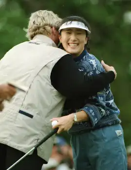 96年大会、プレーオフで優勝を決めた平瀬真由美(右)と、祝福するローラ・デービース。平瀬は米ツアー初V