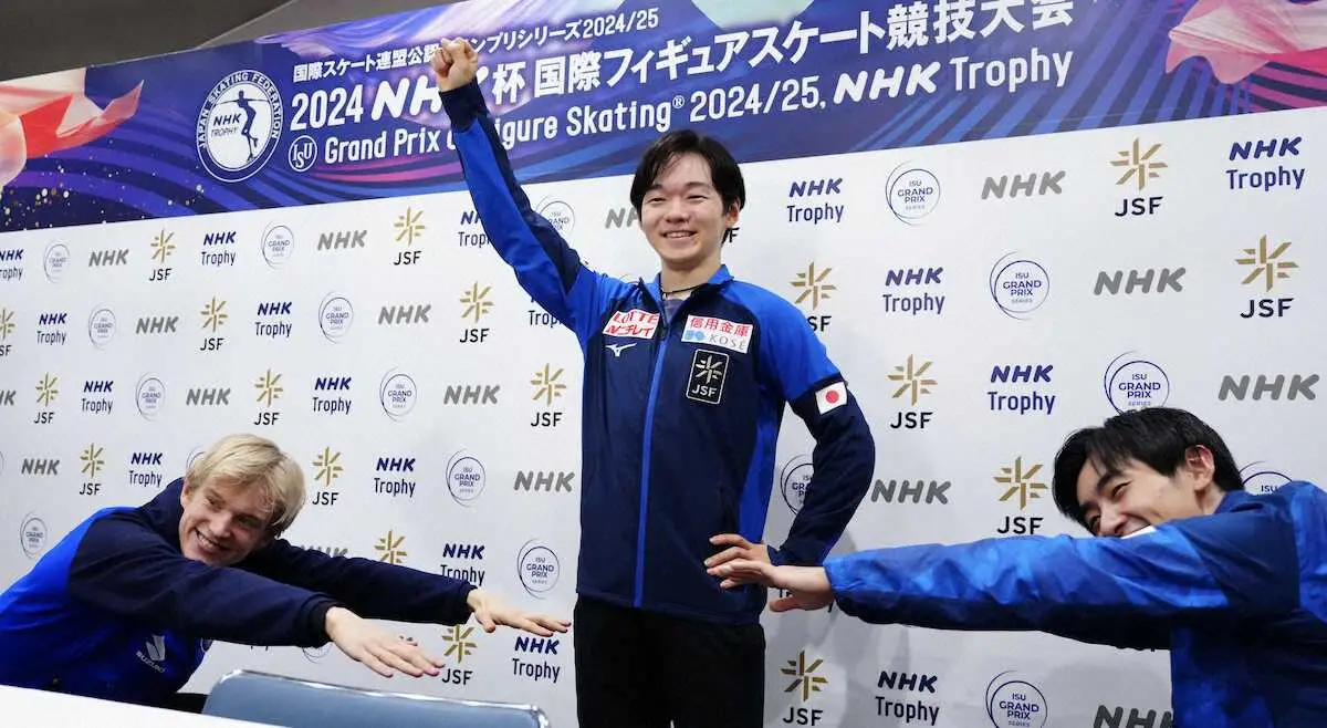 <NHK杯男子>優勝の鍵山優真を称えるダニエル・グラッスル(左)、壷井達也(右)(撮影・長久保 豊)