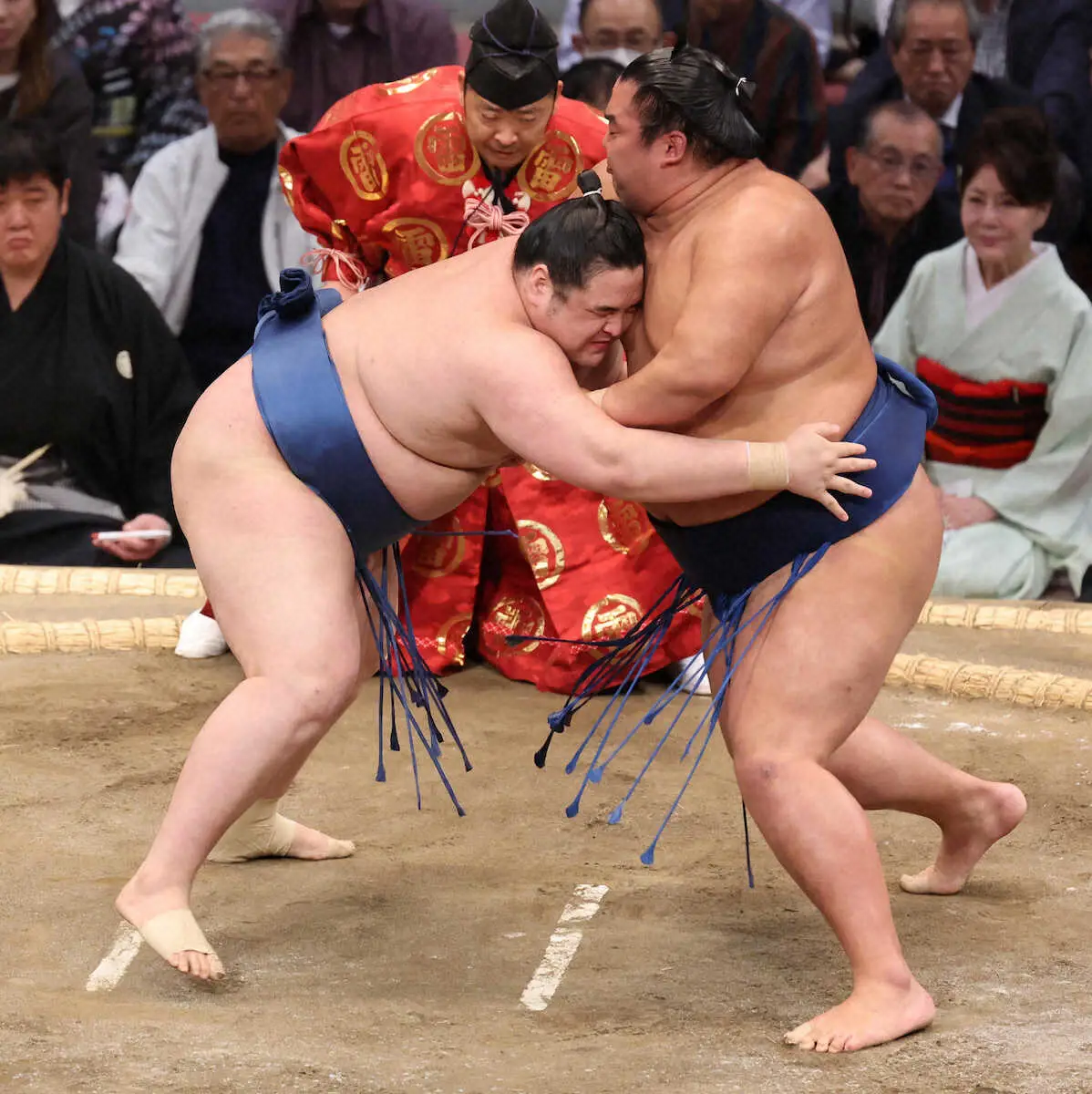 東前頭15枚目・阿武剋(24=阿武松部屋)が西前頭13枚目・湘南乃海(26=高田川部屋)を破り初日から4連勝を飾った。