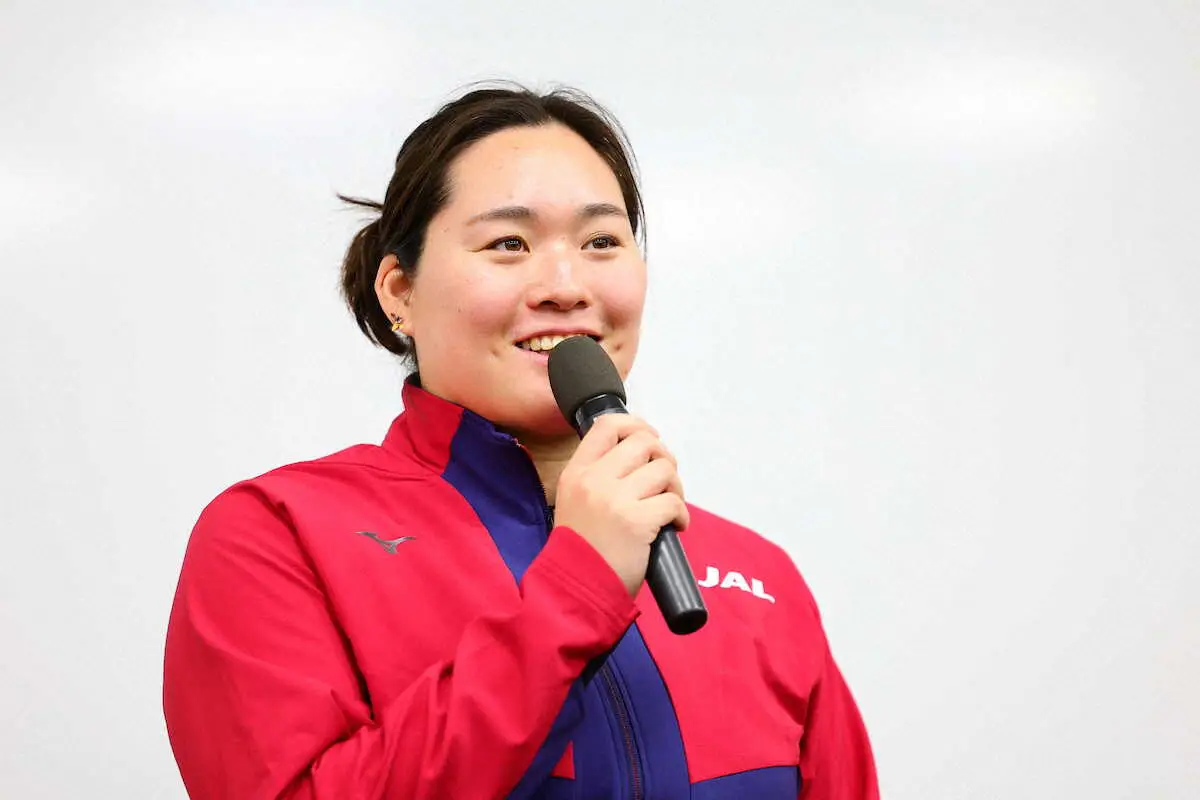 陸上女子やり投げパリ五輪金メダルの北口榛花(JAL)が14日、都内で練習を公開し、報道陣の取材に応じた。