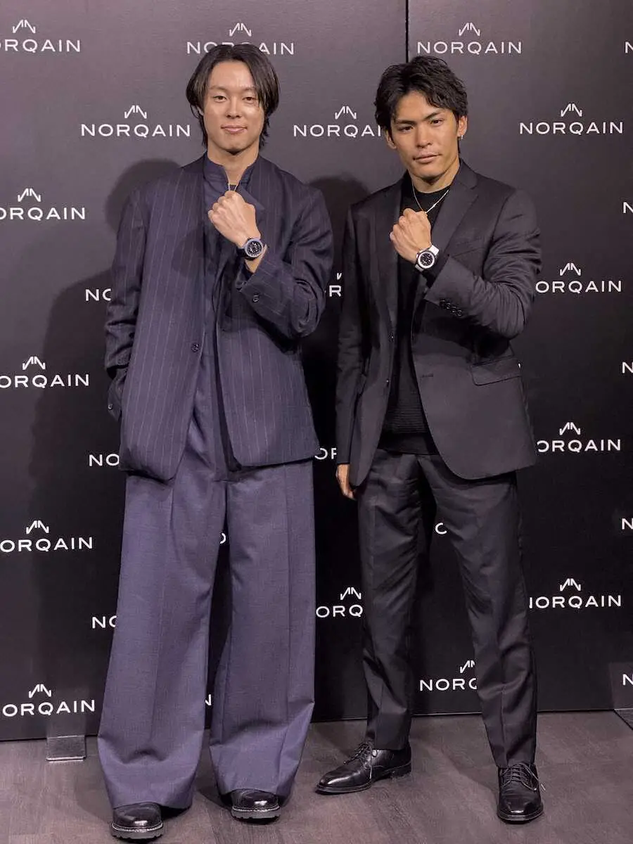 スイス製時計ブランド「ノルケイン」のイベントに出席した小林陵侑(左)と楢崎智亜