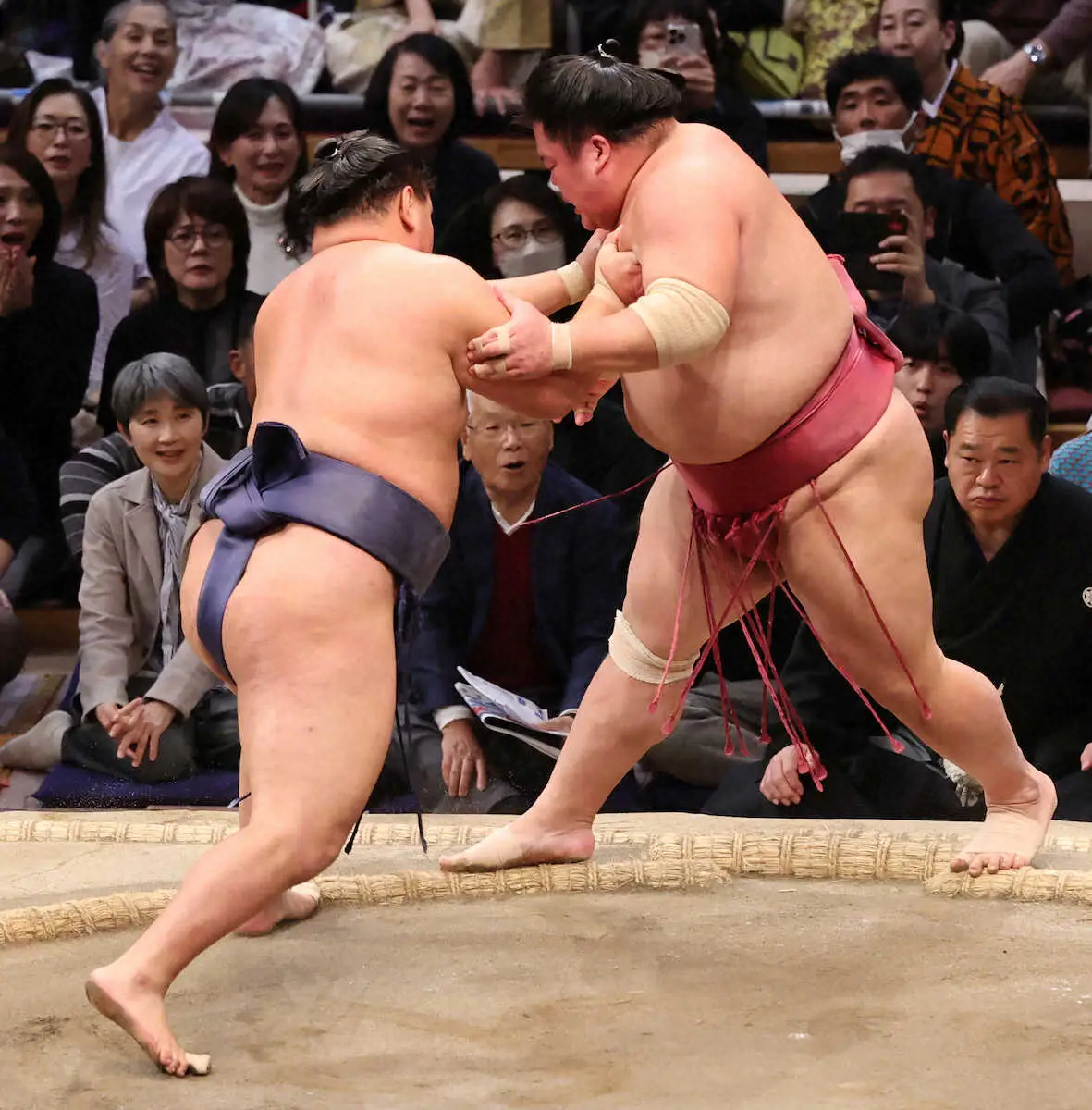 大関・豊昇龍が関脇・大栄翔を押し出して1敗を守った。立ち合いから突き放され、なかなか回しを引けなかったが徐々に間合いを詰め、右、左とつかんで攻略した。