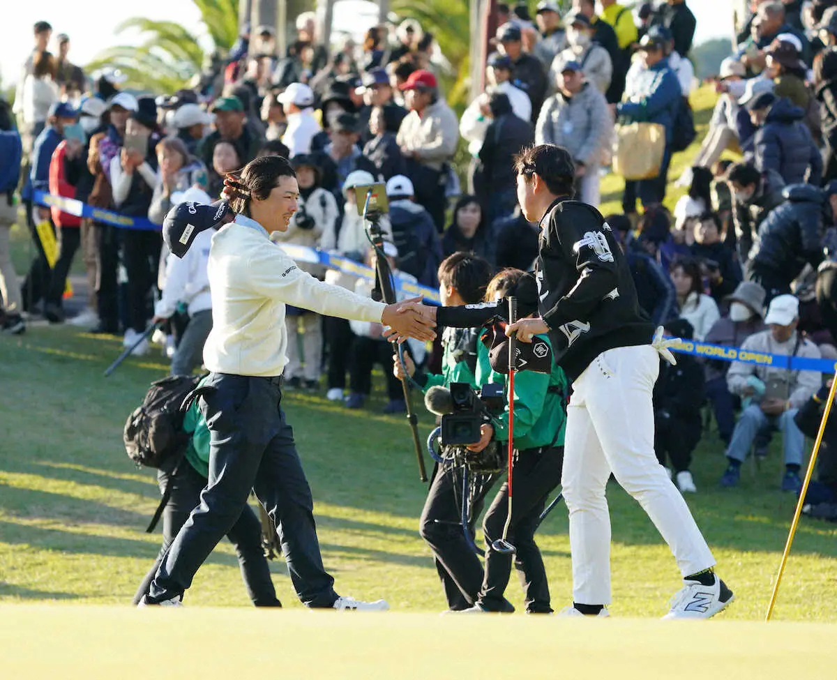 <カシオワールドOP・第3日>18番、ホールアウトし、同伴組の山田大晟(右)と握手する石川遼(撮影・井垣 忠夫)