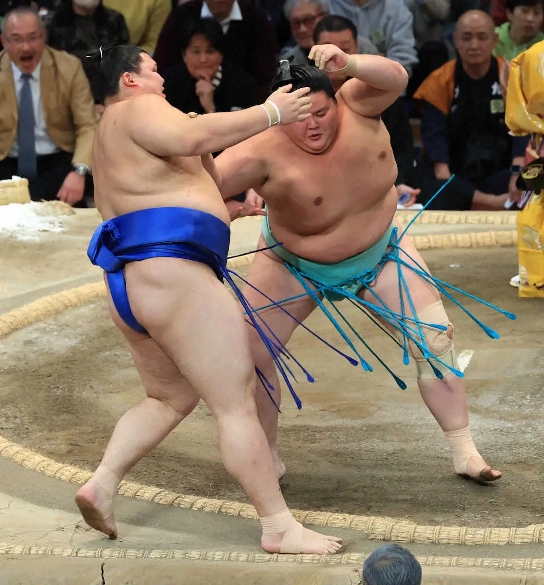 日増しに緊張感が高まる中でもオンとオフの切り替えを大事にしてきた。場所中の朝稽古後は報道陣の取材にも快く応じる。この日も時折笑顔を見せながら「いつも通りですよ。意識することはない」と平常心を強調した。その一方で土俵に上がれば抜群の集中力を発揮。時間いっぱい、最後の塩を取る時には豊昇龍に勝るとも劣らない表情で気合を注入する。右差しを許した大の里の攻めに後退するも左上手を引いて残しながら体を開いて逆転の上手投げ。「(土俵際は)反応できた。(右を差されても)落ち着いて取れました」と振り返った。