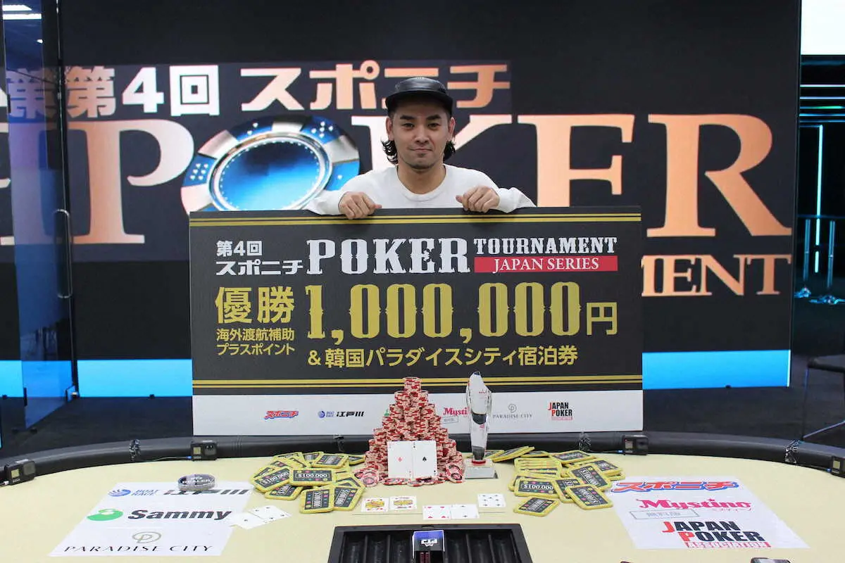 全国のポーカースポットでの予選、DAY1を勝ち抜いた75人が参加し、千葉県の冠雄三さん(36)が初優勝を飾った。優勝特典として海外渡航補助50万円、プラスポイント50万ポイント、韓国パラダイスシティ宿泊券を獲得した。