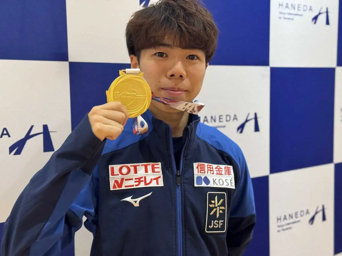 中国杯から帰国し、初のGPシリーズ金メダルを手にほほ笑む佐藤駿