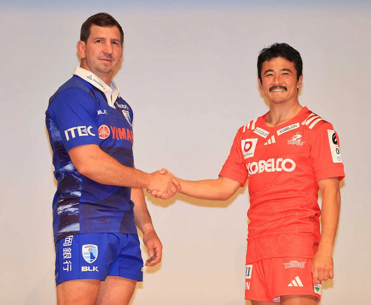 <リーグワンメディアカンファレンス>開幕戦で対戦する静岡のクワッガ・スミス(左)と神戸の日和佐(撮影・篠原岳夫)