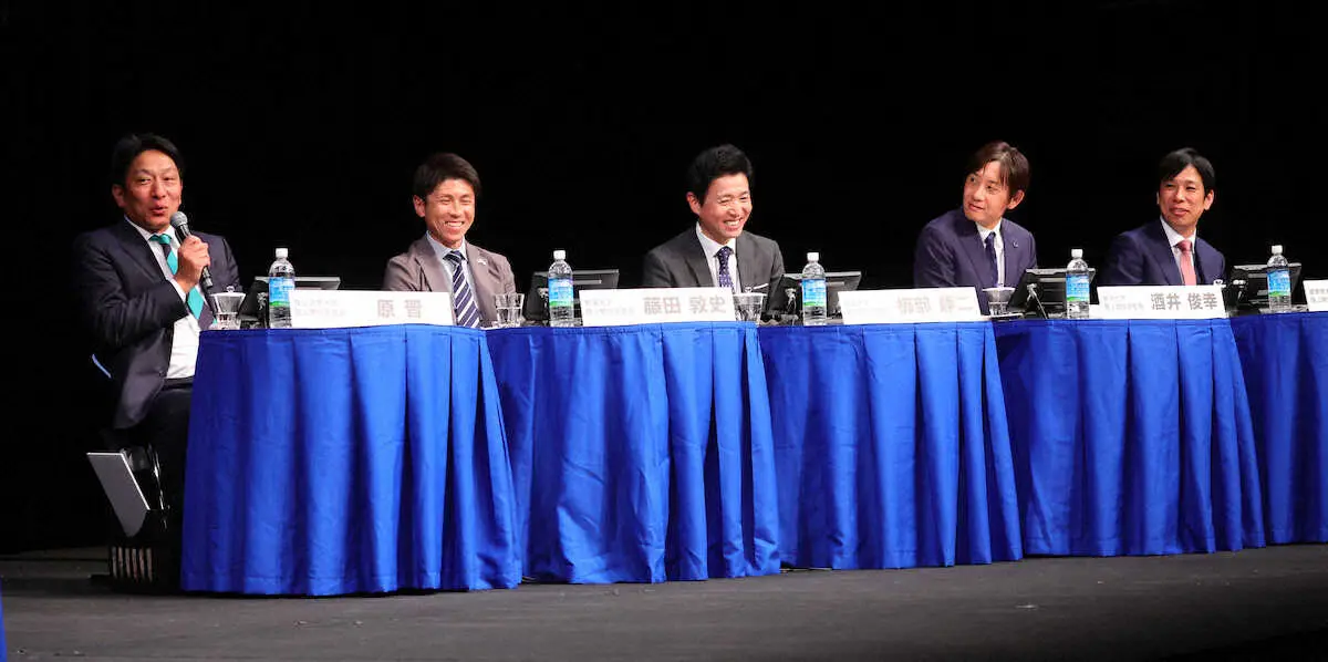 <箱根駅伝記者発表・トークバトル>トークバトルパネリスト(左から)青学大・原監督、駒大・藤田監督、城西大・櫛部監督、東洋大・酒井監督、国学院大・前田監督 (撮影・白鳥 佳樹)