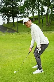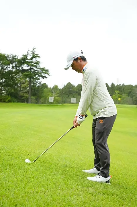 次に、爪先下がりのライですが、先程とは逆に、平地よりもボールが体から離れた位置にきます。したがって、クラブを短く持つ必要はありません。傾斜によっては、それでも届かないことがあるので、その場合は膝を曲げる角度を深くしたり、腰の位置を少し落として対応します。