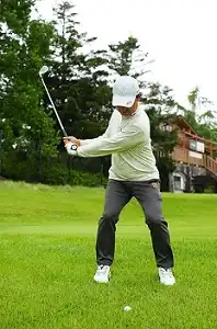 本来、爪先下がりのライから打つと、右へのスライスが出ます、にもかかわらず、左へ曲がるのは、下半身を踏ん張ろうとして、足に力が入り過ぎて、手打ちに拍車がかかりすぎるからです。それを防ぐには、距離を捨てて、コンパクトなスイングを心がけることです。 爪先下がりのライから打つときは、右腰から左腰までの振り幅で十分です。まずはその打ちにくいライから、できるだけ平地に近いライにボールを運ぶことを第一に考えましょう。
