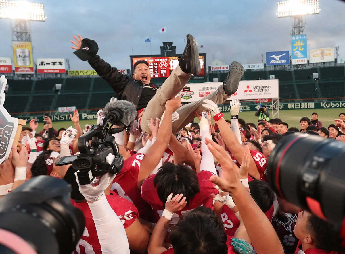 力強い両腕に、心ゆくまで体を預けた。9年ぶりの学生日本一を実感する歓喜の胴上げ。就任1年目の悲願達成に、立命大・高橋健太郎監督は、ようやく表情を緩めた。