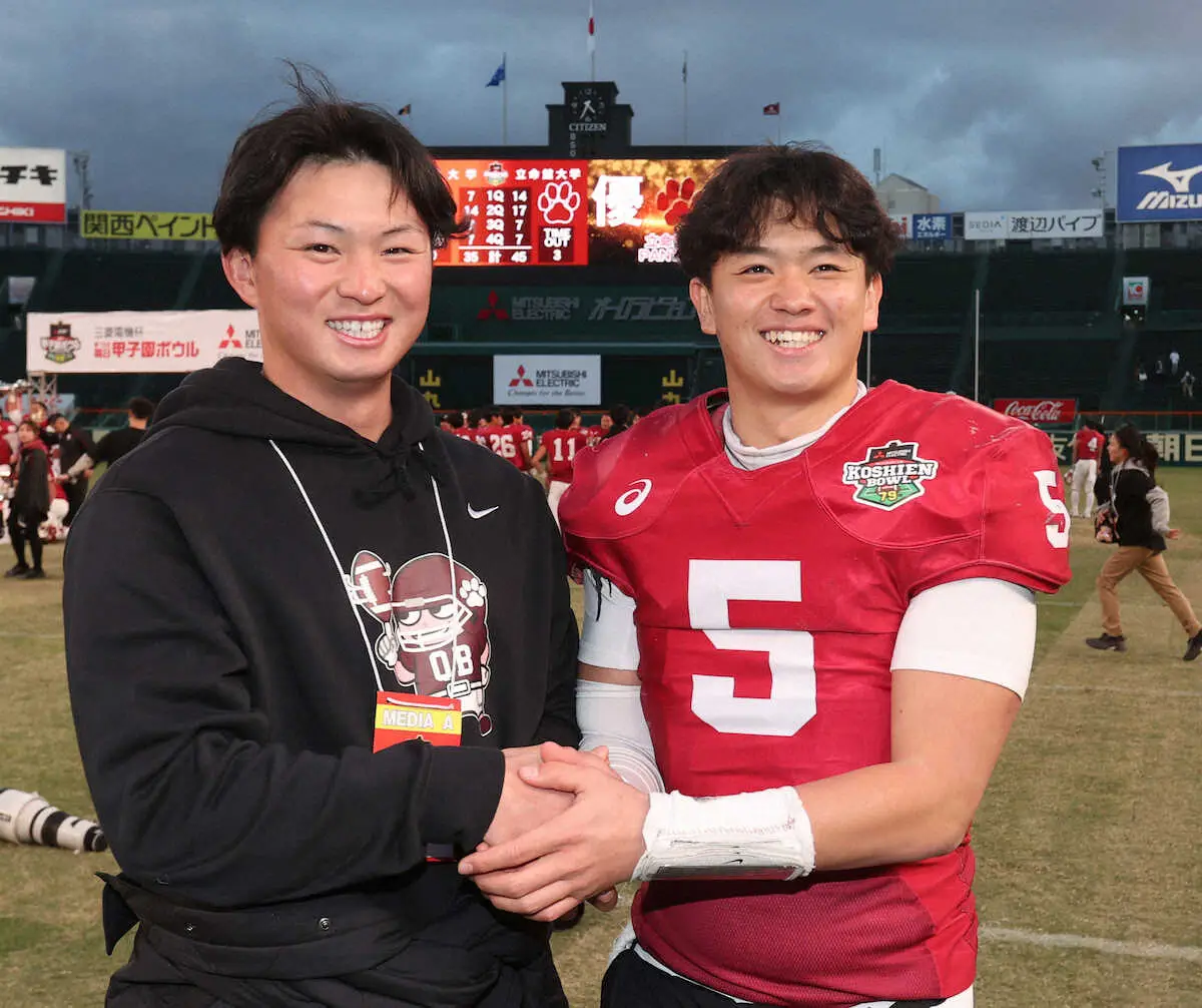 多くの言葉は必要ない。司令塔として勝利へ導いた立命大QB竹田剛(3年)のもとへ、プロ野球・DeNAからドラフト1位指名された兄・祐(三菱重工West)が笑顔で駆け寄る。学生日本一QBとドラ1位選手による「1番」の2ショット。祐は「2人並んで、取り上げてもらうのが夢でした」と声を弾ませ、剛は「竹田家、今年はすごいですよ」と笑った。