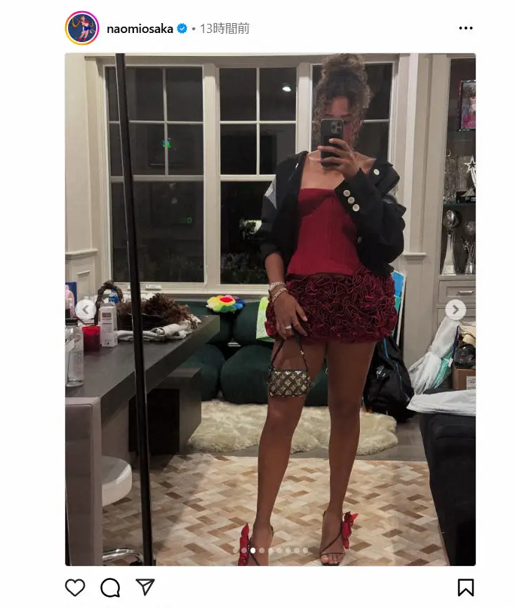 大坂は赤いミニ丈のワンピースに黒いジャケットを合わせたパーティースタイルを披露。動画や写真を投稿し、最新ショットをファンにシェアした。