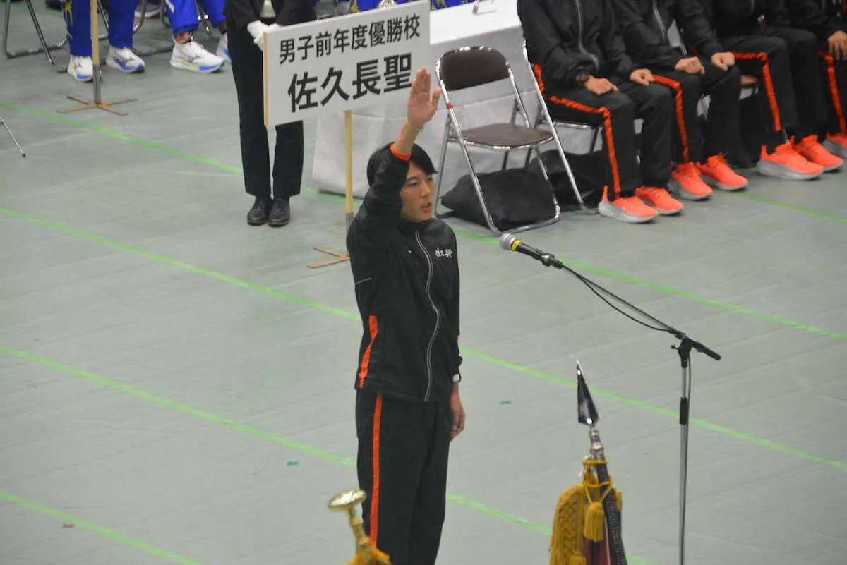 男子第75回女子第36回全国高校駅伝は12月22日、京都市のたけびしスタジアム京都発着で開催される。21日にかたおかアリーナ京都で行われた開会式では、昨年の男子優勝校で佐久長聖(長野)の浜口大和主将(3年)が選手宣誓を行った。
