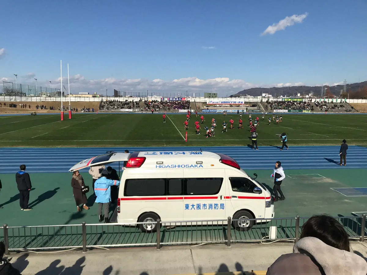 2試合目の高知中央―若狭東戦で、後半途中に高知中央CTBの坂口莉玖(3年)が負傷交代。タンカに乗せられて退場した中、大事を取って救急車が要請され、サイレンを鳴らしてグラウンドに駆けつけた。