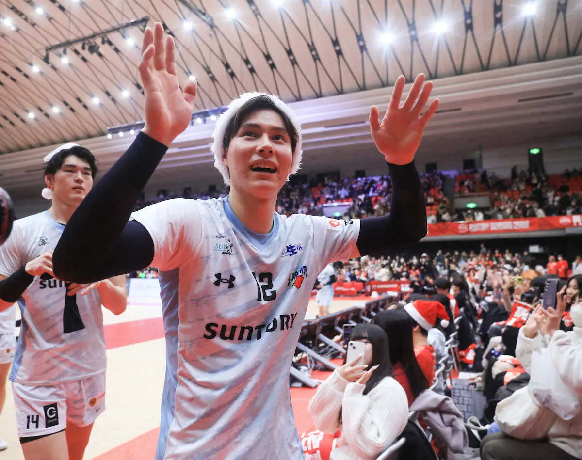<SVリーグ サントリー・名古屋>第3セット、スパイクを決め、アライン(右)とタッチする高橋藍(撮影・中辻 颯太) Photo by スポニチ サントリーが24年最終戦飾る 高橋藍「よいお年を~」チーム2位のスパイク… ギャラリーで見る この記事のフォト 2024年12月30日の画像一覧 もっと見る 2024年12月30日の画像をもっと見る