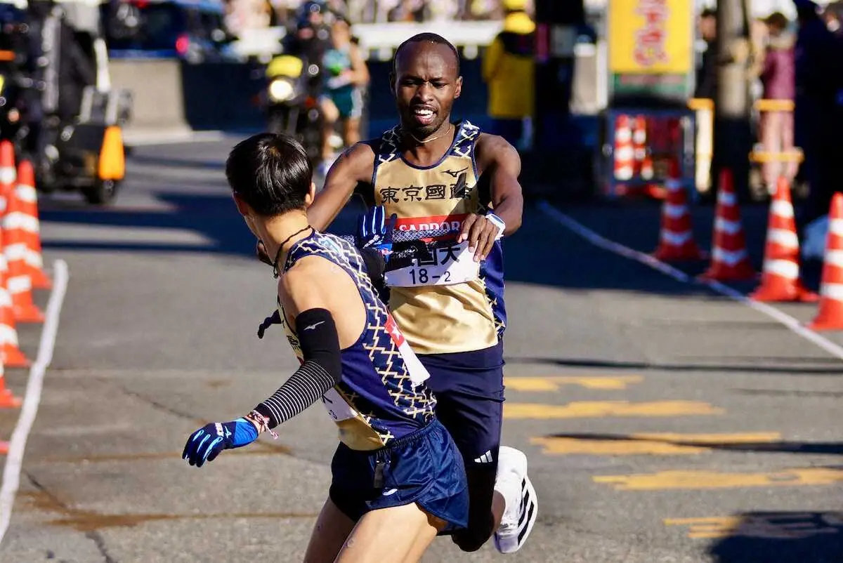 3区・佐藤榛紀にたすきを繋ぐ東京国際大・2区のR.エティーリ(撮影・会津 智海)