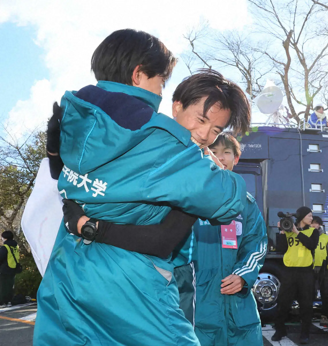 <箱根駅伝復路 大手町ゴール>笑顔でポーズを決める青学大の選手たち。(前列左から)鶴川、白石、若林、野村、太田、田中、(後列同)黒田朝、原監督、宇田川、塩出、小河原(撮影・木村 揚輔) Photo by スポニチ 【箱根駅伝】「若乃神」が苦笑い? 青学大・鶴川が若林と「ケンカ中」と… ギャラリーで見る この記事のフォト 2025年01月03日の画像一覧 もっと見る 2025年01月03日の画像をもっと見る
