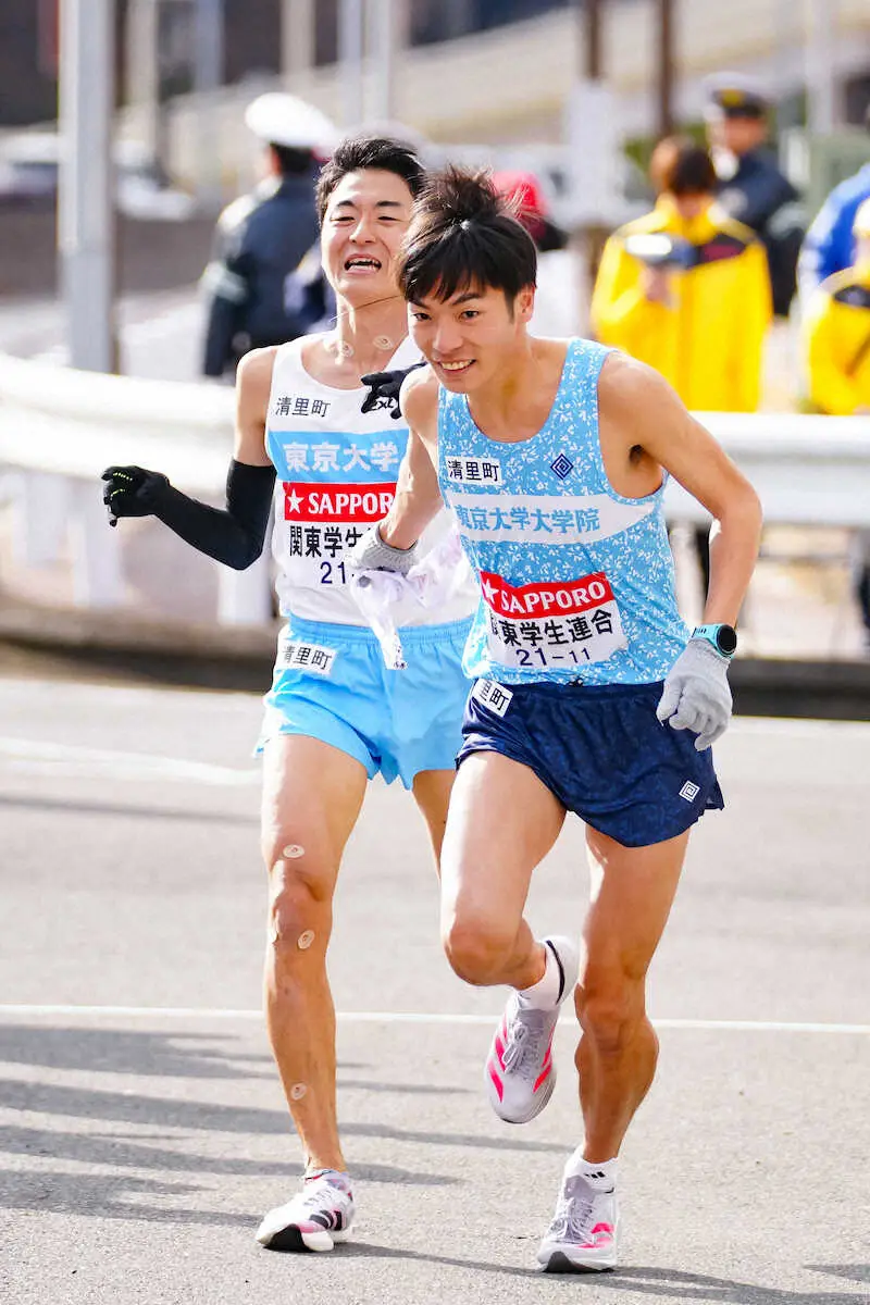 8区の秋吉は7キロ手前の茅ケ崎まで区間記録を上回るラップを刻み、出場選手中トップのペースで力走。オープン参加のため参考記録扱いだが「区間新を狙おうと、序盤は目標通りのペースで走れた」と沿道のファンを沸かせた。区間7位相当のタイムで“先輩”の待つ中継所へ。「2人で箱根を走ろうと言い合いながらずっと一緒に練習してきた。良いたすきリレーになった」と笑顔で振り返った。