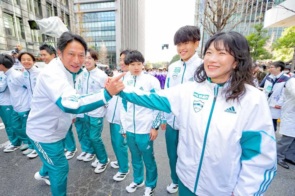 2年連続8度目の優勝を飾りナンバーワンと指さす青学大・原晋監督、妻・美穂さん(代表撮影)