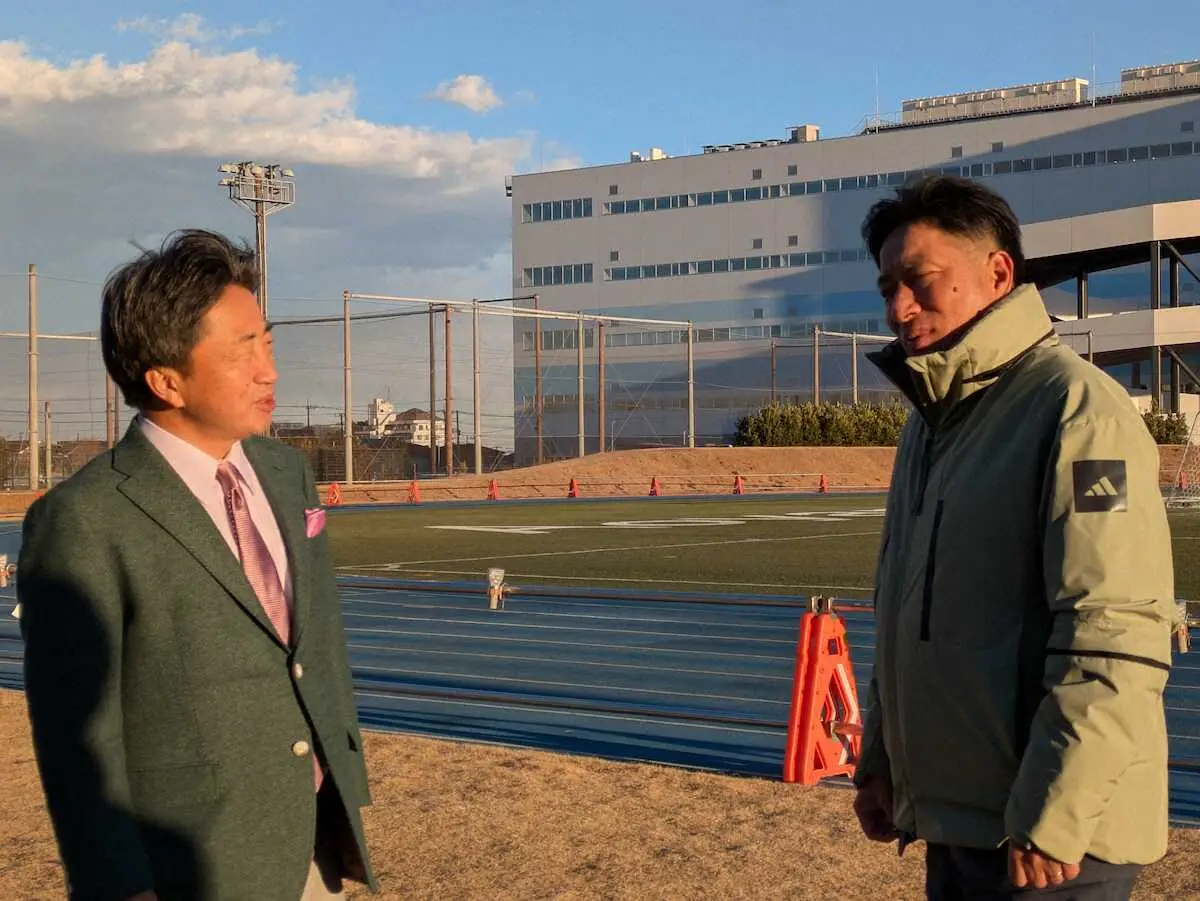 青学大の原監督(右)と岡山県総社市の片岡市長