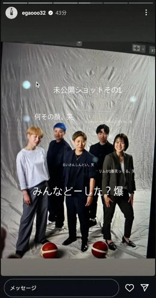 「未公開ショットその1 何その顔。笑 みんなどーした?爆」とつづり、町田瑠唯(富士通)が完全復活。自身と、山本麻衣(トヨタ自動車)、吉田亜沙美(アイシン)、大神雄子氏(トヨタ自動車ヘッドコーチ)がパンツ姿でポーズを取っている写真をアップ。続いて「未公開ショットその2 よく、ユラは身長小さいって勘違いされるんですけど、私がシンさんの次に1番身長おおきい!!!!笑」と同様の写真を投稿した。ユラは宮崎、シンは大神氏のコートネームとなっている。