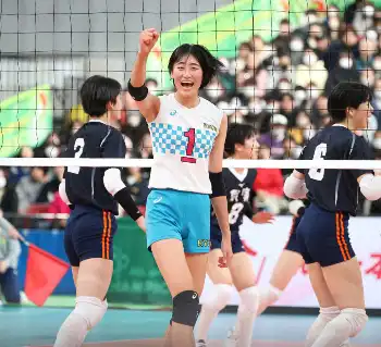エースで主将の秋本がチームを決勝へと押し上げた。セットカウント2―1で迎えた第3セットの20―20の勝負どころ。マークされながらもセンターから相手のブロックを破って21点目を奪った。相手エースとの壮絶な打ち合いを制し、42得点の大暴れで勝利へとけん引。「楽しかった。去年優勝した学校に、自分たちのコンビバレーで勝つことができて凄く良かった」と笑顔で振り返った。