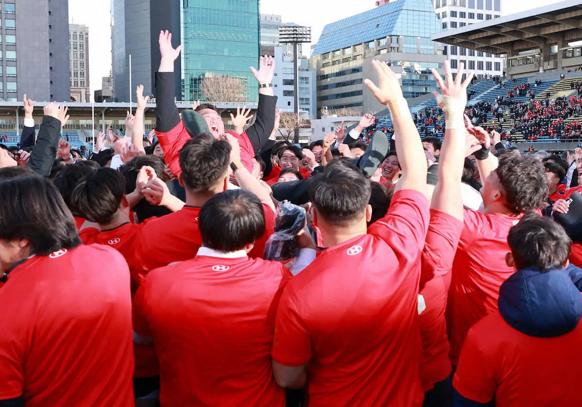 元日本代表PRで現在も130キロ以上ある帝京大・相馬朋和監督(47)の巨体が宙を舞った。4連覇にちなんで4回の胴上げ。「本当に素晴らしい学生たちです。言葉はいらない。一人一人抱きしめたい」と喜びを爆発させた。