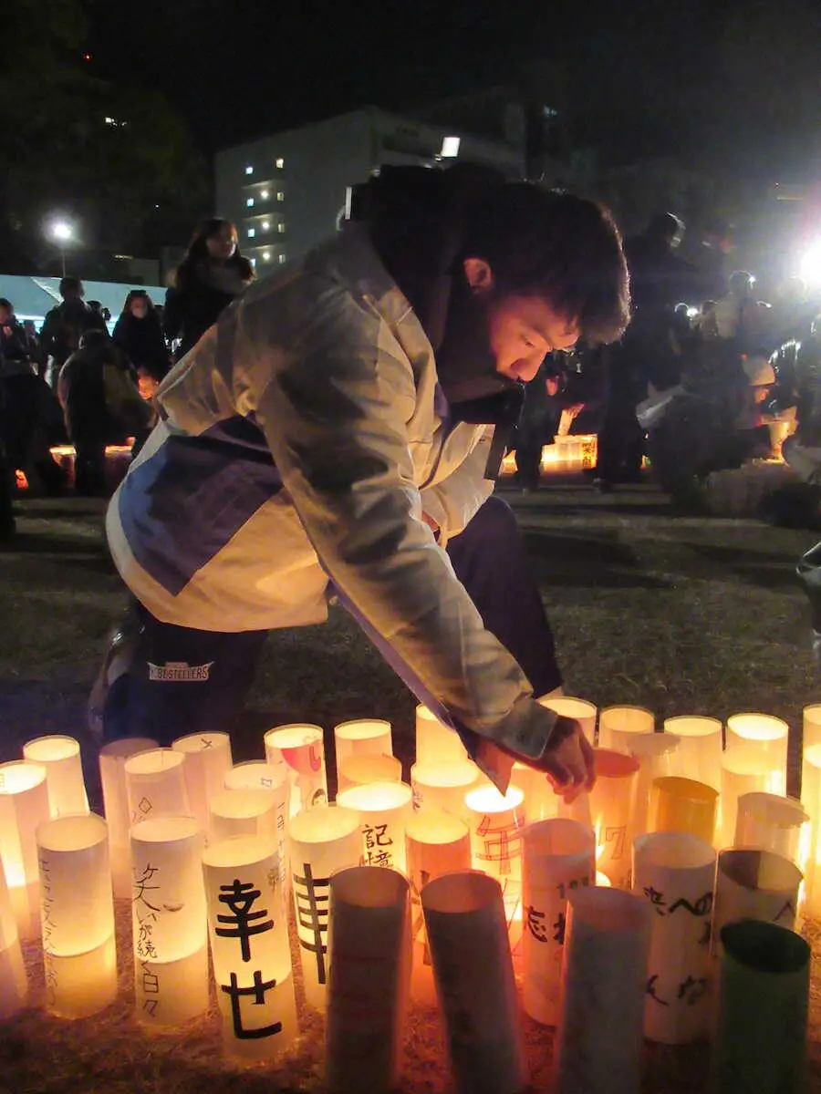 灯籠に点灯し、30年前に地震が発生した午前5時46分に黙とう。神戸市出身の日本代表SO李承信はろうそくを手に灯籠に灯をともし、思いを新たにした。