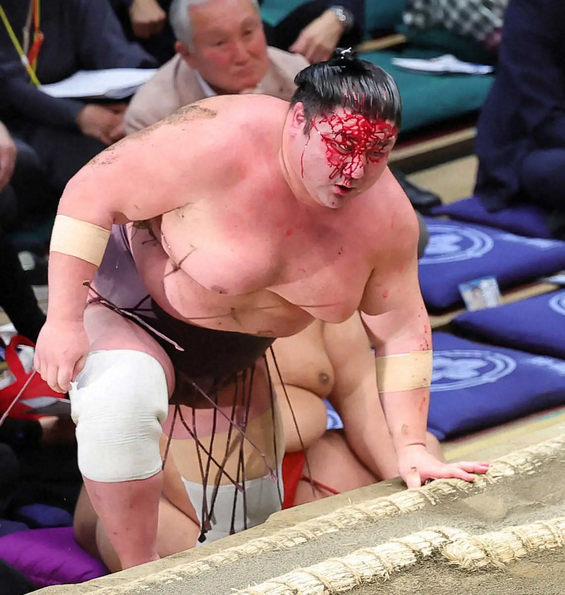 十両の白熊―紫雷は立ち合いで頭と頭が激しくぶつかり、紫雷が激しく出血。最後は白熊が左からのすくい投げで勝利したが、取組後は顔面が血で染まった紫雷の姿に館内も騒然となった。