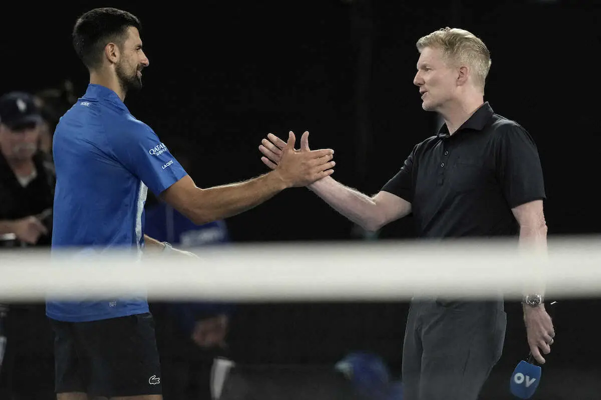 ジョコビッチ(左)はインタビュアーのジム・クーリエ氏と握手(AP)