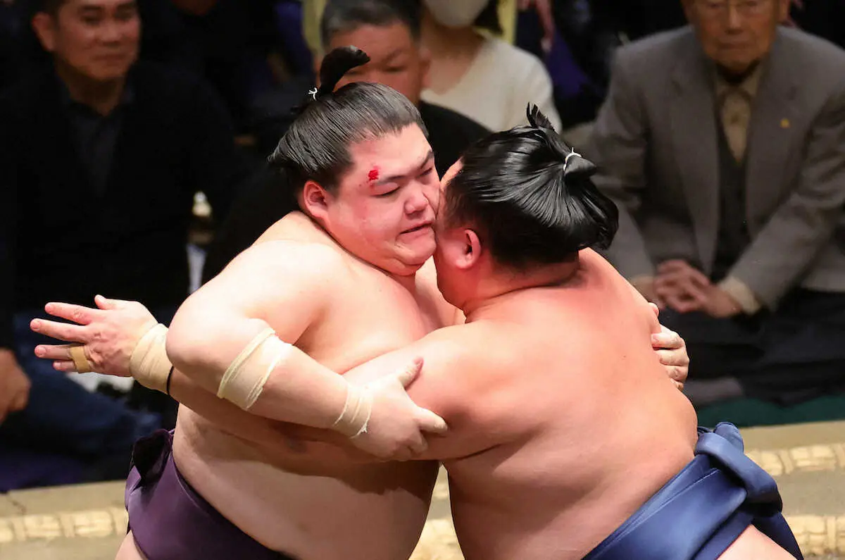 計5度、額同士でぶつかった。突き押しに徹し、40歳で現役を張る玉鷲に24歳も負けていない。王鵬が一度は押し込まれたが、左を差して踏みとどまると右上手を引いて寄り返した。「血は出るけど痛くない。癖になっています」。右額にできた赤く血のにじんだすり傷が勲章のようだった。
