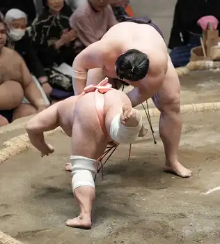 史上初の三役未経験で2度目の賜杯を狙う西前頭11枚目・尊富士は東小結・阿炎を押し出しで破り3敗を死守した。