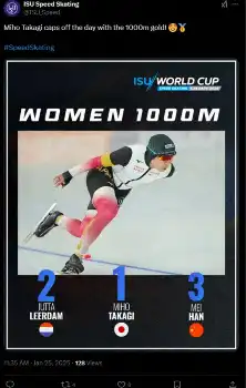北海道出身の高木は16年12月にW杯初勝利をマーク。17~18年シーズンに団体追い抜きと1500メートルでW杯総合優勝を果たし、日本女子で初めて全種目の総合優勝に輝いた。同シーズンにはオールラウンドの世界選手権でも日本女子初の総合優勝を飾った。冬季五輪では18年平昌大会の団体追い抜き、22年北京大会の1000メートルで金メダルを獲得。来年2月のミラノ・コルティナ五輪でも活躍が期待される。