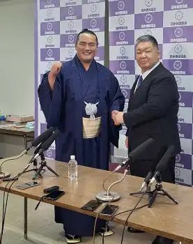<豊昇龍 横綱昇進 伝達式>伝達式の前にピースサインをする豊昇龍(左)(撮影・西海健太郎) Photo by スポニチ 2025年01月29日の画像一覧 もっと見る 2025年01月29日の画像をもっと見る