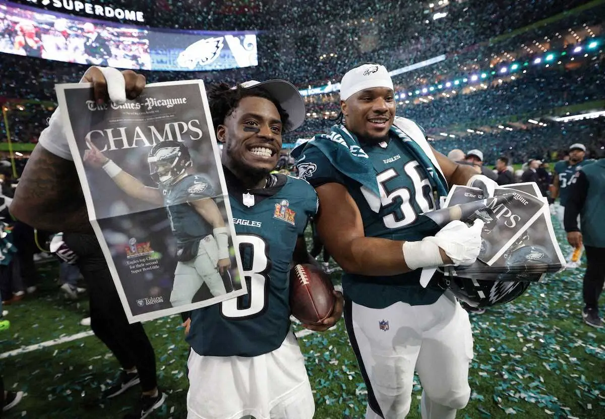 <チーフス・イーグルス>スーパーボウル制覇の“号外”を手にするイーグルスのガードナージョンソン(左)とスティーン(ロイター)