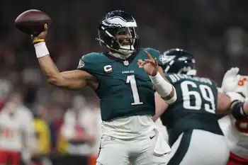 MVPにはイーグルスのQBジェイレン・ハーツ(26)が選ばれた。パス22本のうち2TDを含む17本を成功させて221ヤードを獲得し、ランでも第1Qの先制TDを含む11回のキャリーで72ヤードを獲得。スーパーボウルでパス200ヤード以上およびTDを記録し、さらにランで50ヤードを獲得して得点を挙げたのは、49ersが85年にドルフィンズを破った試合のジョー・モンタナ以来2人目だった。