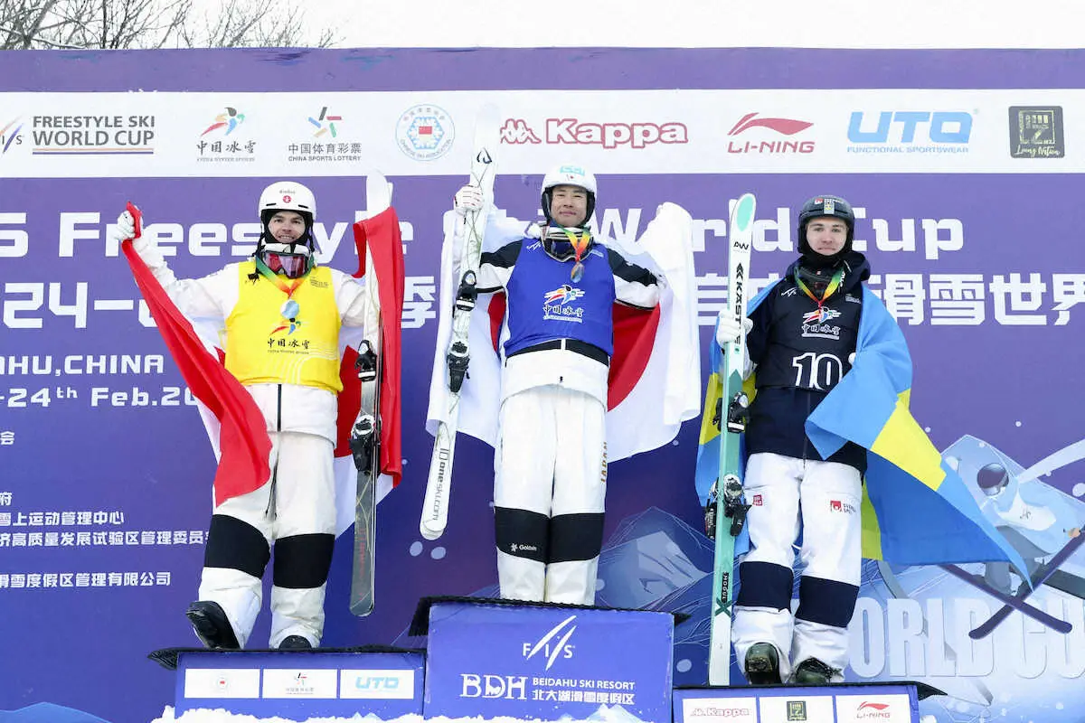 モーグルW杯第11戦で優勝した堀島行真(中央)=北大湖(taro.tampo/FIS提供)