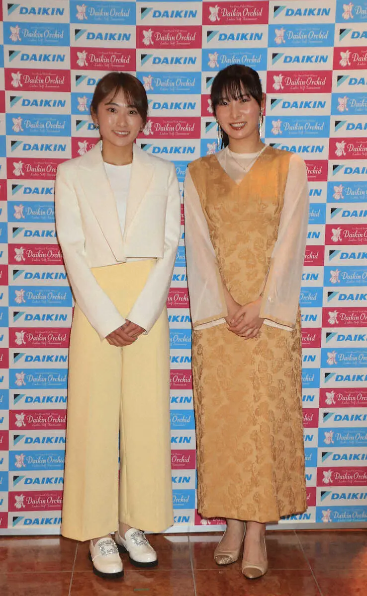 <ダイキンオーキッドレディース前夜祭>ドレスアップして前夜祭に出席した臼井(左)と稲見 (撮影・西川祐介)