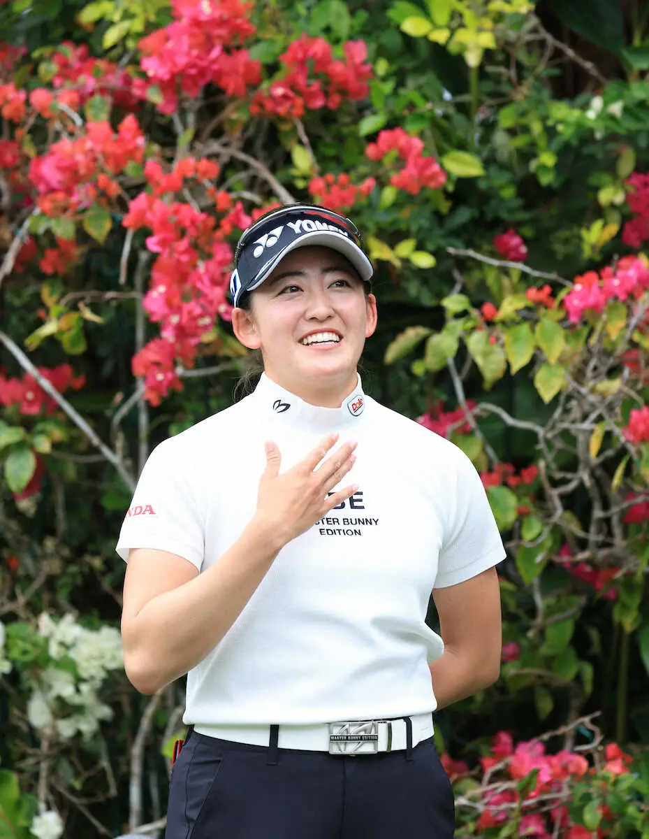 予選ラウンドは姉の明愛、仲の良い小祝さくらと同組。今週、3人で食事もしており「組み合わせが一緒になるかもと話していたけど、まさか3人一緒になるとは思っていなかった。組み合わせを見た時に凄くうれしかった」と笑顔を見せた。