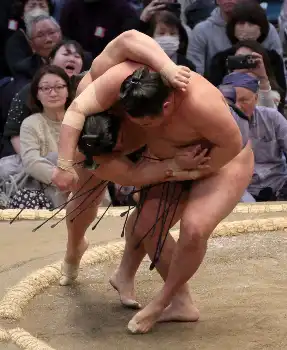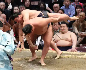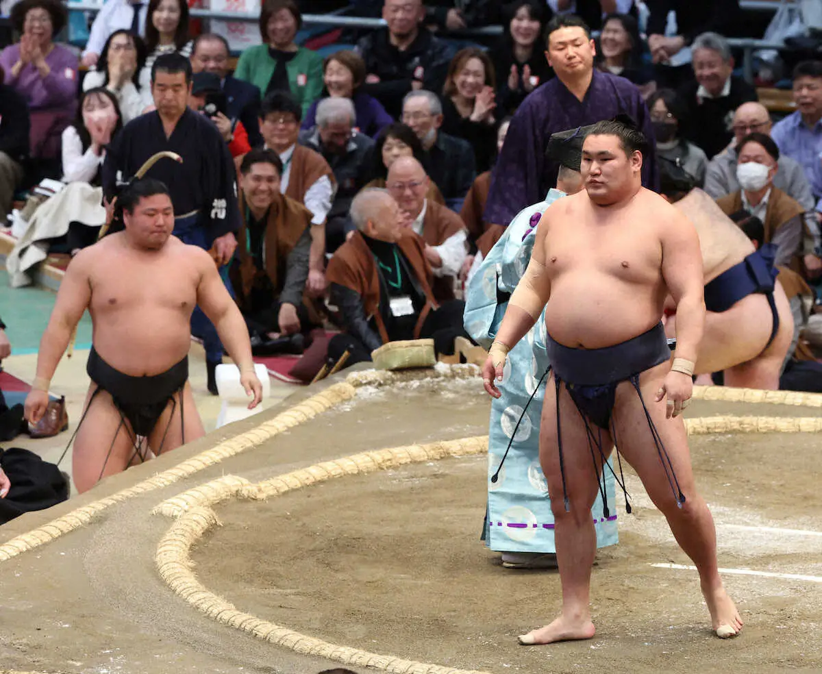 2連敗中の新関脇・王鵬は東前頭3枚目・翔猿と対戦。過去3勝3敗と引き分けの状態だったが、立ち合いから一気に押し出し、初白星を挙げた。