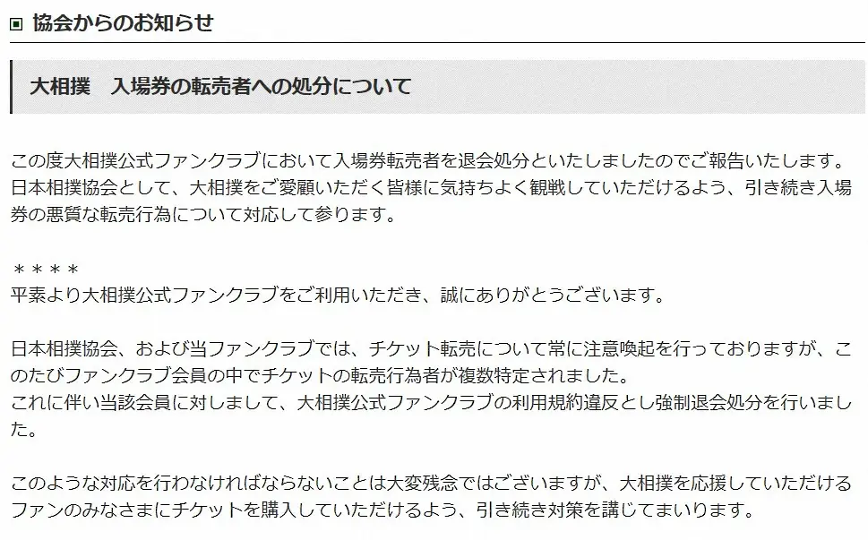 協会は「日本相撲協会、および当ファンクラブでは、チケット転売について常に注意喚起を行っておりますが、このたびファンクラブ会員の中でチケットの転売行為者が複数特定されました」と報告し、「これに伴い当該会員に対しまして、大相撲公式ファンクラブの利用規約違反とし強制退会処分を行いました」と発表。