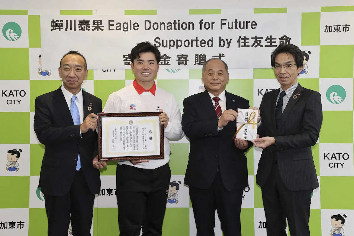 男子ゴルフでツアー4勝の蝉川泰果(24=アース製薬)が17日、地元兵庫県の加東市役所で「蝉川泰果 Eagle Donation for Future Supported by 住友生命」の寄付金贈呈式に出席した。