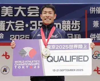 代表選考会を兼ねた日本選手権は、昨年10月の35キロと今年2月の20キロで、いずれも歩型違反を取られた。厚底シューズの影響で後ろの足が早く上がる癖を修正。この日は警告なしで日本歴代4位の好タイムを出した。川野(旭化成)に次ぐ代表入りで、3大会ぶりの大舞台へ「センターポールに日の丸を掲げたい」と威勢良く言った。