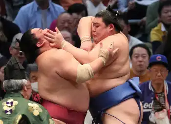 西前頭筆頭の若元春が給金直し 左四つで熱海富士を寄り切る