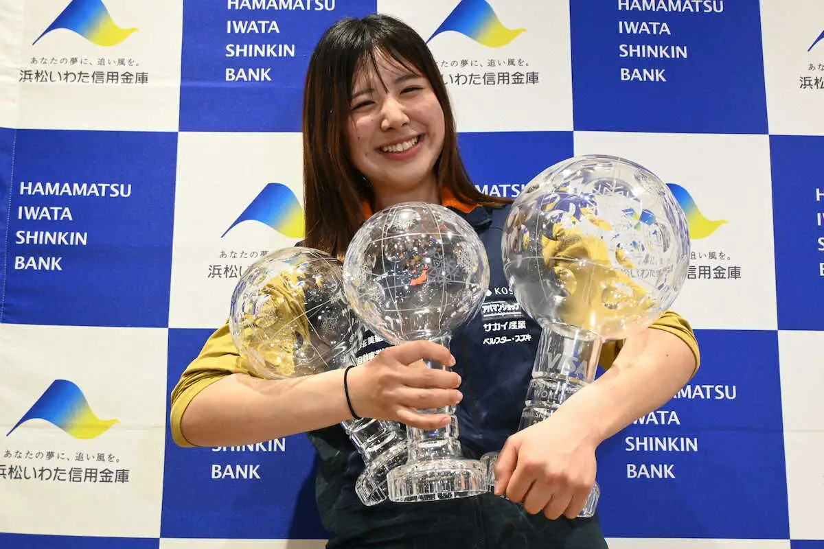 22年北京冬季五輪代表の三木は、今季W杯で17戦中4勝を含む13度の表彰台と抜群の安定感を発揮。それでも勝利数は4に留まったことに「そこまで多くない」とどん欲。一方で直前の試合で年間ランキング2位に順位を下げて迎えたW杯最終戦で優勝し、逆転で総合優勝を飾ったことに「強いプレッシャーが掛かっていたので、印象に残っている」とその試合で獲得した木製のトロフィーを愛おしげに眺めた。