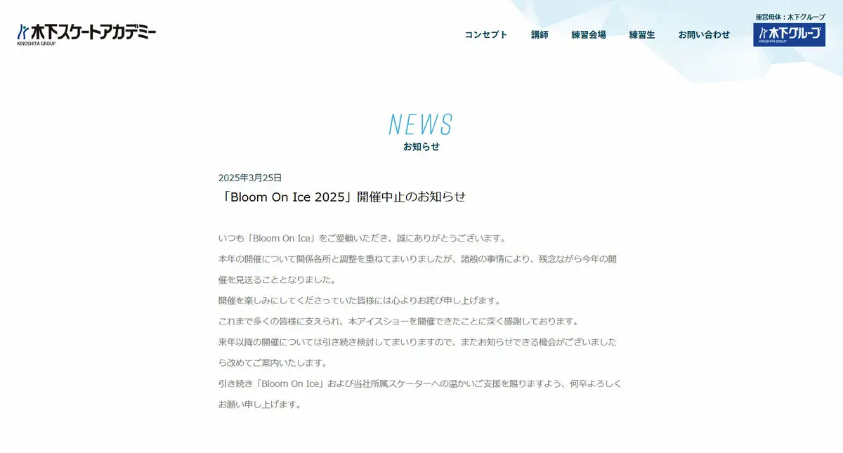 アイスショー「Bloom On Ice 2025」を主催する木下スケートアカデミーは25日、今年の公演について開催中止を決定したと発表した。同公演は2021年から昨年まで4年連続で開催していた。