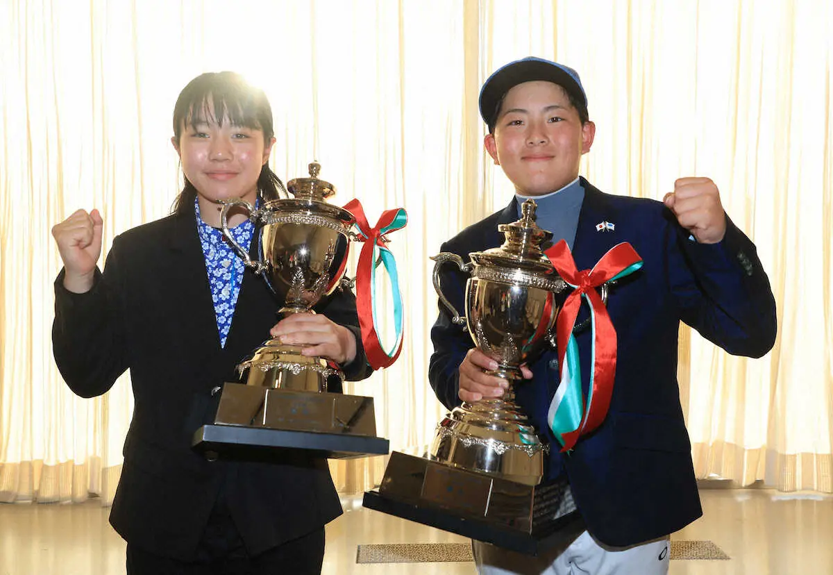 <男子>福井は初日首位の広橋とマッチプレーを展開し、後半一歩抜けだし「1、2打差を追うのは好きなパターン。相手のゴルフは見ず、自分のゴルフに集中しました」と胸を張った。時に10メートルを超える強風に対しては「低めのドローを心がけ、クラブを4番手くらい上げたホールもあった」と攻略した。23年世界ジュニア優勝、昨年は男子の下部ツアーにも出場。4月からの中学では「世界ジュニア優勝とプロツアーで好成績を上げること」が目標だ。