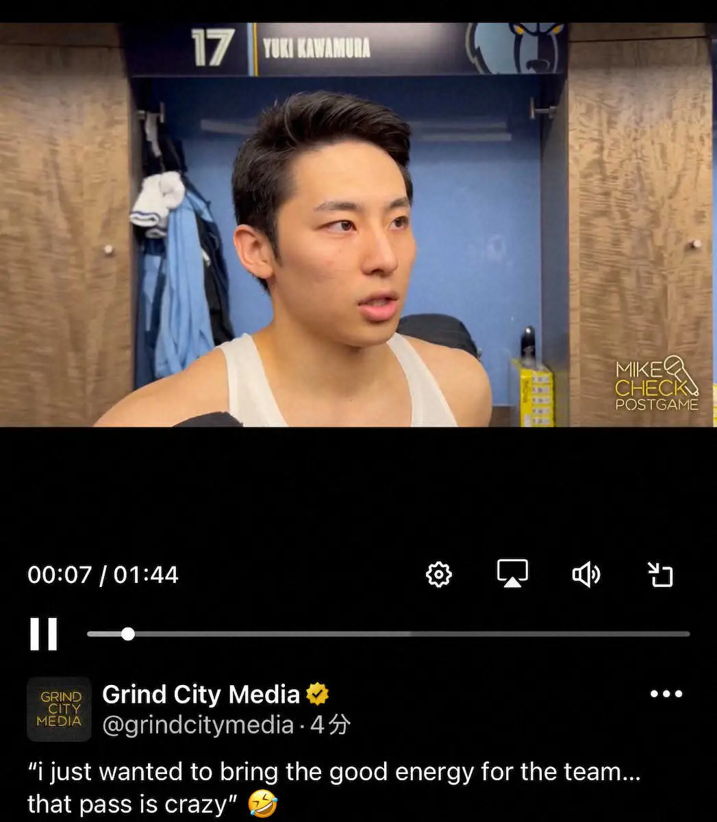 試合後に自身のプレーを振り返る河村勇輝。グリズリーズの公式メディア「グラインド・シティ・メディア」の公式X(@grindcitymedia)から